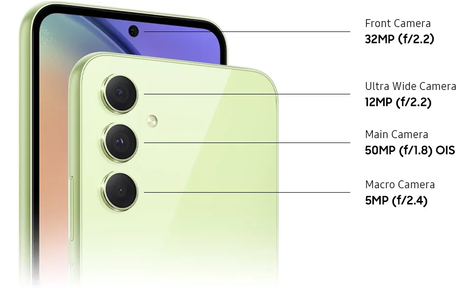 Hãng đã tạo ra một thiết kế cụm camera tối giản trên Galaxy A54 với việc bố trí 3 ống kính theo kiểu riêng lẻ. Với mỗi ống kính, hãng đã sử dụng viền kim loại nhô cao để bảo vệ tốt hơn cho mặt kính camera, hạn chế tình trạng trầy xước khi đặt máy xuống các mặt phẳng.