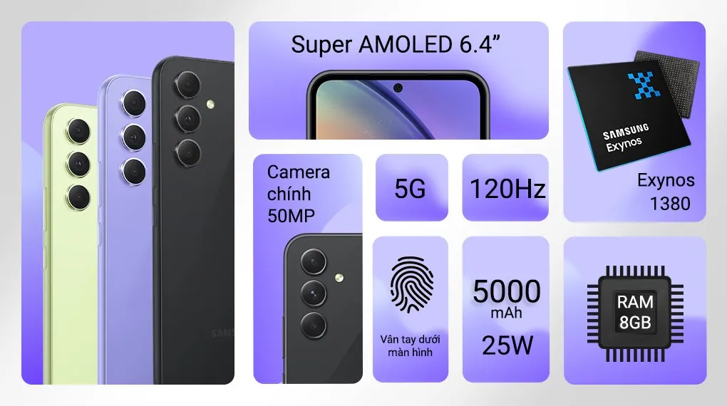 Samsung Galaxy A54 5G là mẫu điện thoại tầm trung hiện đang làm mưa làm gió tại thị trường Việt Nam khi sở hữu những thông số ấn tượng với chip hiệu năng cao, màn hình chất lượng đi cùng hệ thống camera xịn sò trong phân khúc.
