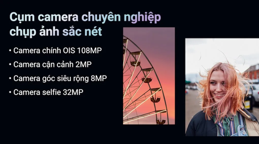 Galaxy M54 5G được trang bị ba camera ở phía sau, đặc biệt với camera chính lên đến 108 MP, camera góc siêu rộng 8 MP, cùng với camera macro có độ phân giải là 2 MP. Điều này cho phép mình có trải nghiệm chụp ảnh tốt hơn và tự do sáng tạo với nhiều chế độ độc đáo.