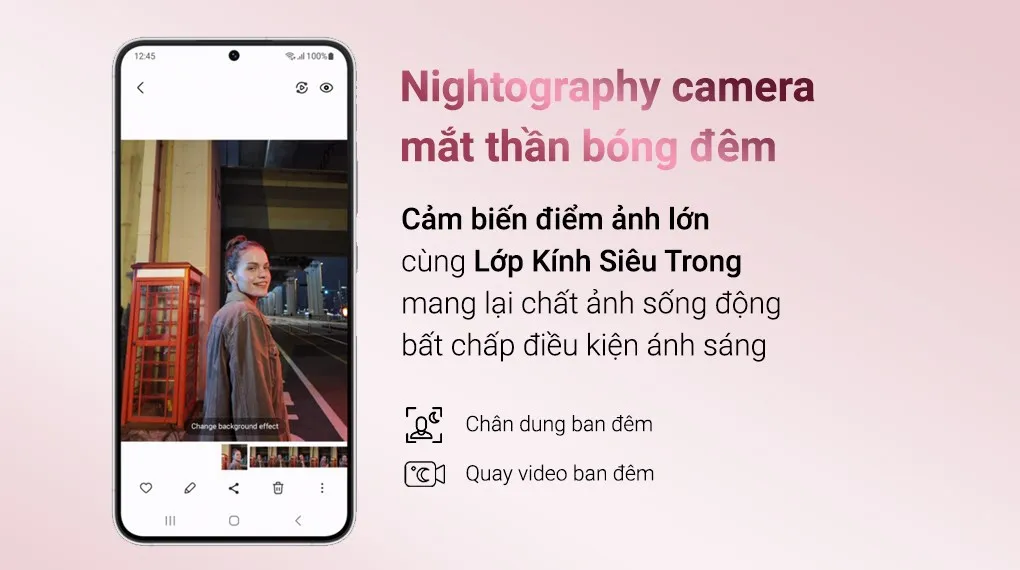 Galaxy S22 cung cấp 3 camera sau, gồm camera chính 50 MP, camera góc siêu rộng 12 MP và cuối cùng là camera tele 10 MP. Trong đó, camera chính có cảm biến điểm ảnh lớn nhất cùng Lớp Kính Siêu Trong giảm lóe sáng vén màn mọi chi tiết ẩn sâu, biến những tác phẩm về đêm của bạn trở nên nổi bật hơn.